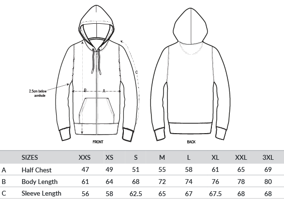 Set-in sleeves. Self-fabric lined hood. Covered metal zip at centre front. Round drawcords in matching body colour with closed metal tipping. Metal eyeletss. 1x1 rib at sleeve cuffs and bottom hem. Kangaroo pocket. Double-needle topstitches at the armhole, sleeve cuffs and bottom hem. Herringbone tape at the inside back neck seam and inside of the zip. Self-fabric half moon at back neck.